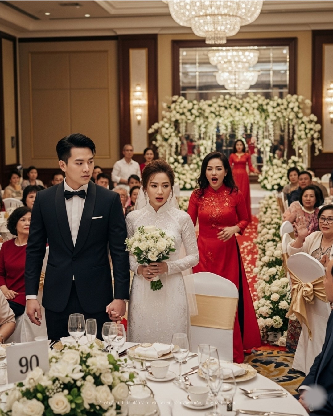 Tiệc cưới diễn ra trong một nhà hàng sang trọng, ánh đèn lấp lánh và tiếng cười vang vọng. Linh, trong chiếc váy cưới trắng tinh, nắm tay Huy, ánh mắt tràn đầy hạnh phúc. Nhưng khi buổi lễ sắp bắt đầu, cánh cửa chính bỗng bật mở. Một bóng dáng quen thuộc bước vào, khiến cả căn phòng chìm trong im lặng. Đó là Ngân.