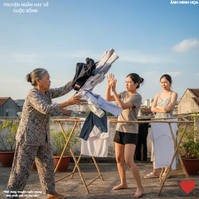 Cô vác rổ quần áo bước lên những bậc thang cao vút, mồ hôi bắt đầu lấm tấm trên trán. Sân thượng vắng lặng, chỉ có nắng và gió. Mai bắt đầu công việc phơi phóng, từng chiếc áo, chiếc quần được cô giũ phẳng phiu, treo lên dây cẩn thận, như thể cô đang sắp xếp lại những mảnh vụn vỡ trong lòng mình.