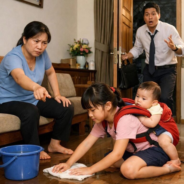 Con gái tôi—Mi, tám tu//ổi—đang qu//ỳ sụp xuống sàn gỗ, hai tay cầm chiếc giẻ thô ráp chà xát vào một vết ố. Trên lưng nó, thằng em tr/ai mới hai tu//ổi được buộc chặt bằng một chiếc khăn cũ. Thằng bé ng/ủ g/ục, đầu vẹo sang một bên, nước dãi chảy ướt vai áo chị. Đôi chân nhỏ xíu của Mi run bần bật vì sức nặng của em, nhưng nó không dám đứng dậy. Nó cắn chặt m/ôi đến r/ỉ m//áu, mắt ráo hoảnh vì có lẽ nước mắt đã cạn từ lâu. Tôi định lao đến, nhưng tiếng chuông điện thoại vang lên từ phía bếp khiến tôi khựng lại. Tôi đứng nép sau bức tường, chiếc điện thoại trong túi quần đã vô thức bật chế độ ghi âm. “Ừ, tôi bắt co//n b/é làm quen rồi,” tiếng bà Lan vang lên, ráo hoảnh và lạnh lùng, khác hẳn giọng nói ngọt ngào thường ngày. “Con chị lớn thì cho nó tập việc sớm, không sau này hư. Tiền của ông chủ tôi vẫn trích ra gửi về cho bà đều đấy, cứ bảo là tiền tôi làm thêm.”