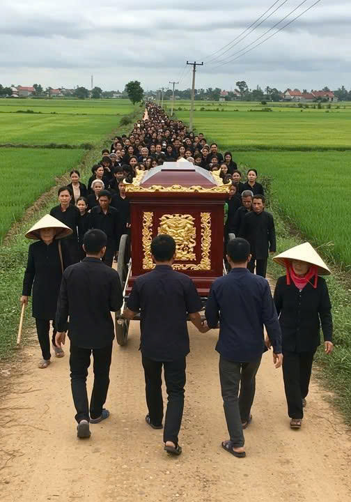 Gia đình lập tức hoãn việc đưa cụ ra đồng. Quay xe về nhà. Trận gió đêm ấy thổi mạnh đến mức rèm trắng phấp phới như có ai đang kéo. Sáng hôm sau, lễ tang cụ Mận được làm đúng lễ, đủ nghi thức, trống kèn vang khắp làng. Mọi người xếp hàng xin lỗi trước linh cữu: — “Mẹ ơi, tha cho chúng con… vì sự vội vàng ngu muội.”