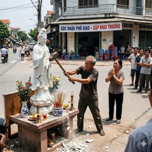 Khi mảnh sứ cuối cùng vỡ vụn dưới chân, ông Thái thở hắt ra một hơi thỏa mãn. Ông không nhìn thấy, hoặc cố tình không nhìn thấy, những ánh mắt ái ngại của vài người hàng xóm đi ngang qua. Với họ, bức tượng ấy là một phần ký ức, là nơi họ dừng chân thắp một nén nhang cầu bình an mỗi sớm mai hay chiều muộn. Nhưng với ông Thái, đó chỉ là dọn dẹp một chướng ngại vật. Tương lai của ông là những bàn nhậu đông khách, những tiếng cụng ly và những đồng tiền chảy vào túi.