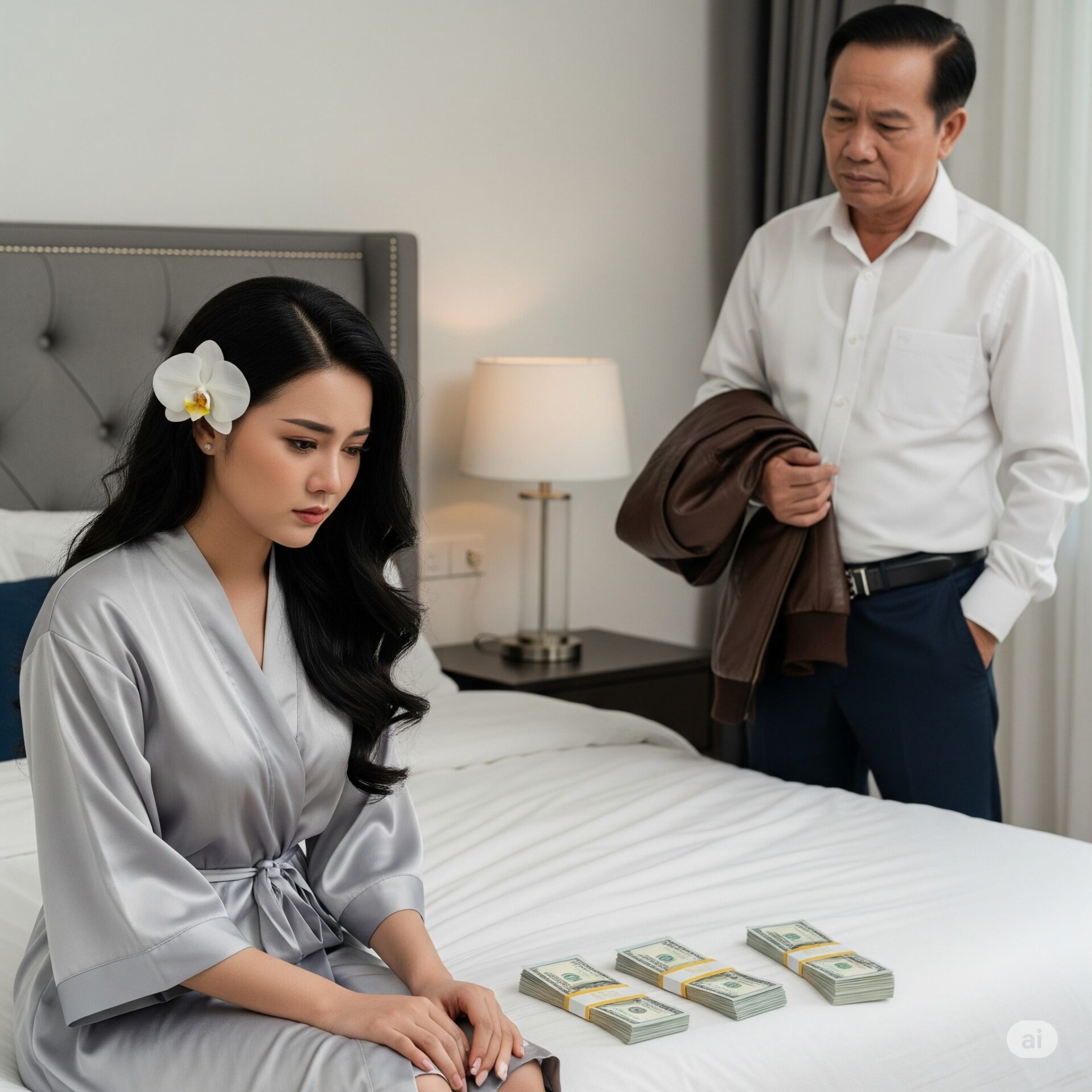 My run rẩy. Cô chưa từng nghĩ sẽ phải đánh đổi bản thân, nhưng cũng không thể để mẹ chết vì thiếu tiền. Đêm ấy, cô theo ông đến khách sạn. Mọi thứ diễn ra rất nhanh, không hề có sự thân mật, chỉ là một đêm lặng lẽ, lạnh lẽo. Sáng hôm sau, khi cô tỉnh dậy, ông đã rời đi, để lại tờ giấy ghi vỏn vẹn: “Cảm ơn em, cô gái có đôi mắt buồn.”