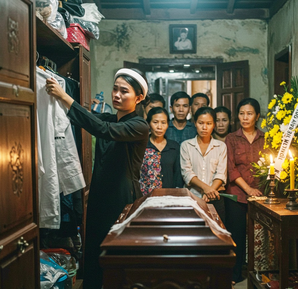 Ngày ông Thước mất, em chồng kéo nhau về đầy nhà. Khóc lóc, bày vẽ, tổ chức rình rang.