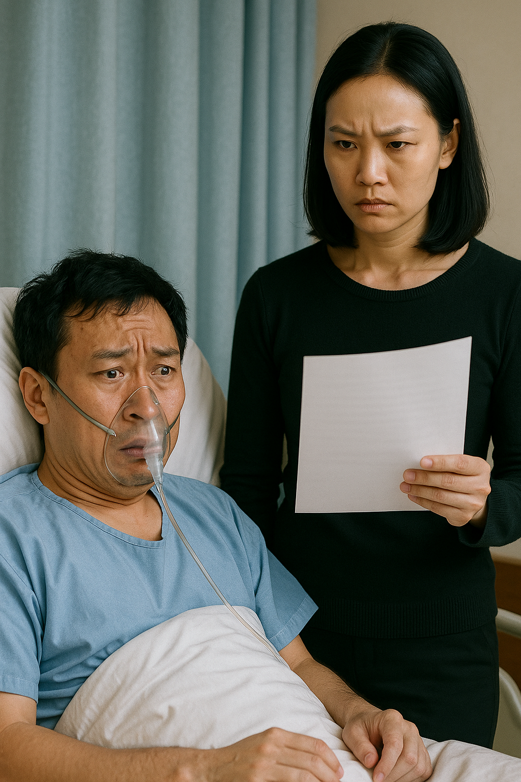 Cả căn phòng lặng im, chỉ còn tiếng máy thở và nhịp tim dồn dập. Dũng cúi đầu, nước mắt rơi trên má, lần đầu tiên trong nhiều năm đối diện sự thật trước vợ.