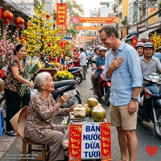 Gần năm giờ chiều, khi dòng người bắt đầu hối hả đổ về nhà cho bữa cơm tất niên sớm, một chiếc xe ô tô đen bóng sang trọng đỗ xịch trước sạp dừa nhỏ. Một người đàn ông nước ngoài bước xuống. Ông ta cao lớn, mái tóc muối tiêu chải chuốt gọn gàng, diện bộ vest xám trông rất lịch lãm nhưng gương mặt lại mang một nét u buồn khó tả. Ông đứng lặng lẽ nhìn những quả dừa lăn lóc trên nền đất, rồi ánh mắt dừng lại ở đôi bàn tay đang run rẩy vì lạnh và mệt của bà Sáu.