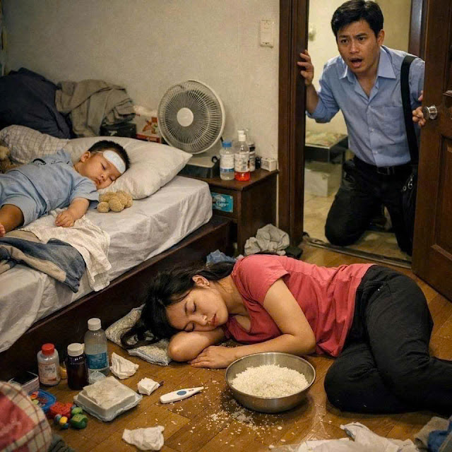 Căn phòng tối om, rèm cửa kéo kín. Mùi thuốc hạ sốt, mùi mồ hôi chua nồng, và mùi… phân của trẻ con xộc thẳng vào mũi anh.